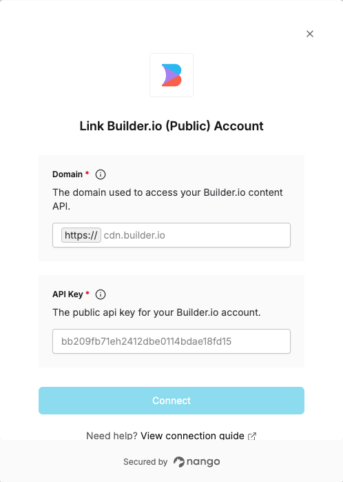 To authenticate with Builder.io (Public), you will need:- API Key – A public key that grants Nango permission to use Builder.io’s Content API.