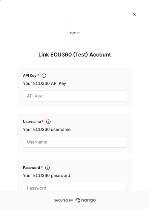 Your Username and Password are the same credentials you use to log in to your ECU360 account. You’ll need these along with your API key to authenticate.