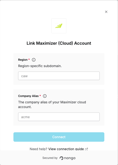 To connect Maximizer (Cloud) with Nango, you need:- Region – The region-specific subdomain.