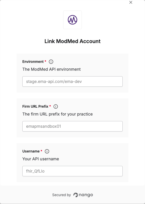 To authenticate with ModMed, you will need:- Environment - The environment you’re connecting to (sandbox or production)