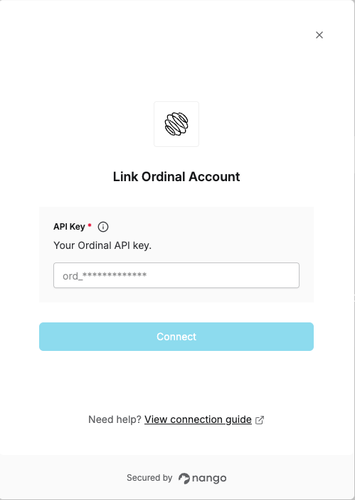 To authenticate with the Ordinal API, you will need:- API Key – A key that grants secure access to the Ordinal API, allowing authorized applications to interact with Ordinal.