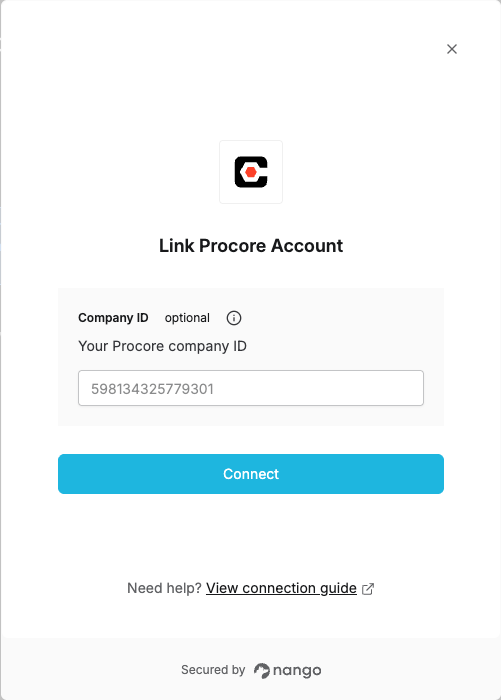 To authenticate with Procore, you will need:- Company ID (optional) - The ID of the Procore company you want to connect to.