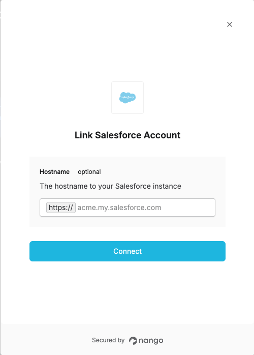 The hostname is optional. If not provided, Nango will use the default Salesforce login endpoint (