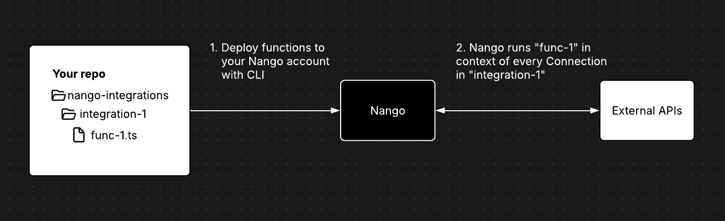 Functions are Nango’s TypeScript runtime for building custom integrations. You write integration logic in TypeScript and deploy it to Nango. Functions execute with built-in access to authenticated APIs, retries, storage, and observability. Functions are a flexible primitive that you can use to build any integration use-case, from simple API actions to complex data syncs, RAG pipelines & real-time webhook ingestion. Pair Functions with the AI integration builder to generate and maintain integration code faster: Combine the speed of AI with human-reviewable code you fully control.How it works