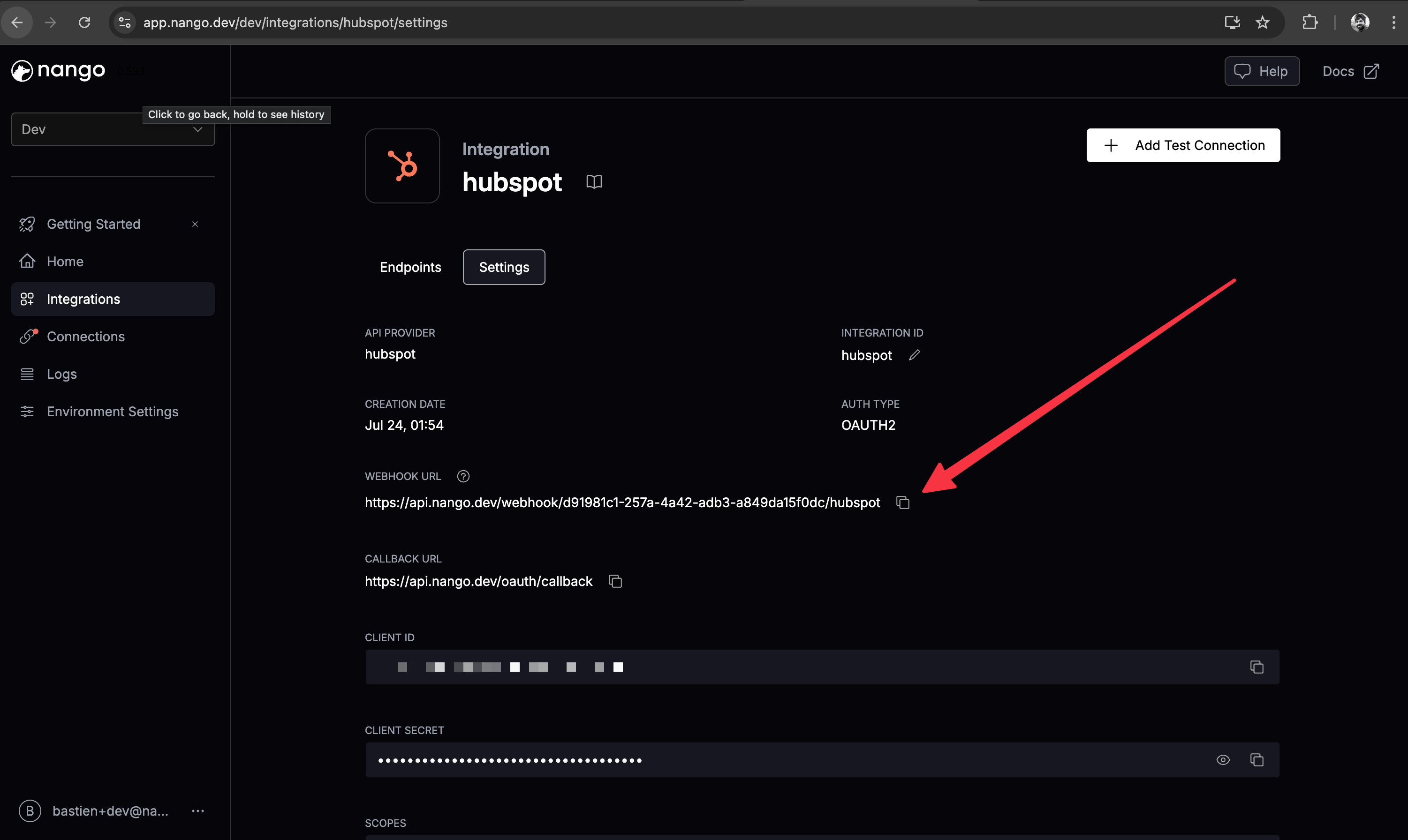 d91981c1-257a-4a42-adb3-a849da15f0dc) is specific to your Nango account. - The integration ID (hubspot) identifies the integration receiving the webhook.