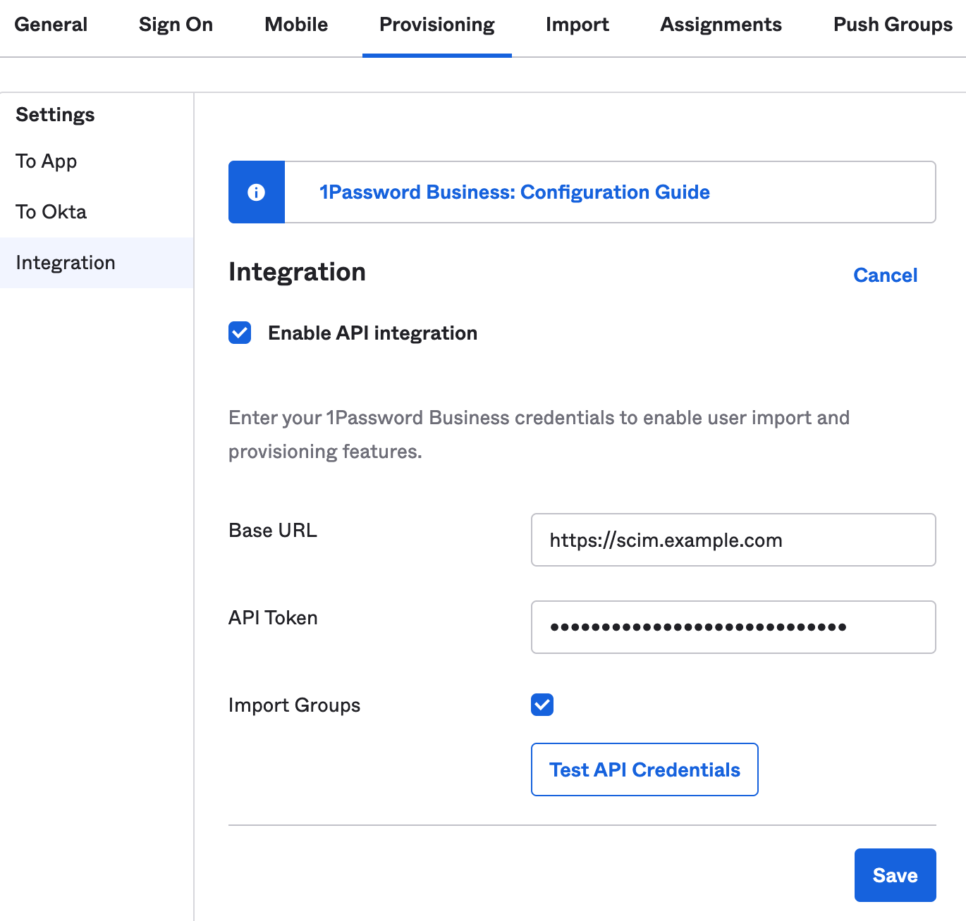 • A SCIM API Key generated from your 1Password Admin Console.