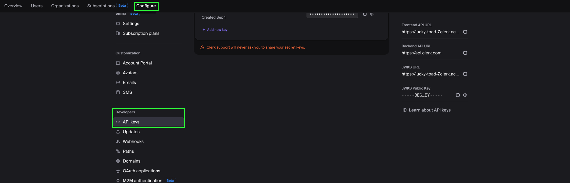 - Navigate to Configure > Developers > API Keys