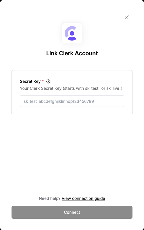 To authenticate with Clerk, you need:- Secret Key - A key that grants Nango permission to interact with Clerk’s APIs resources and services.