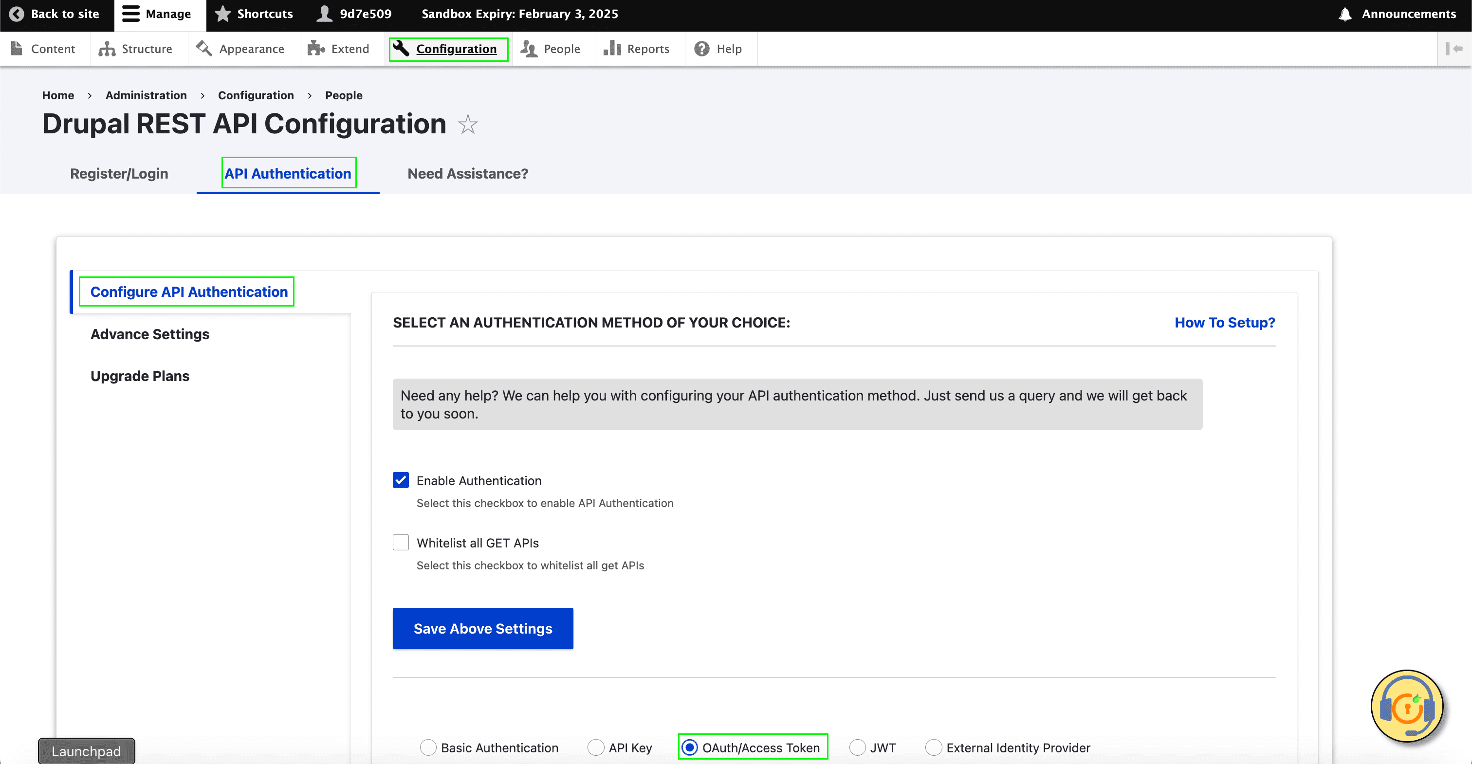 - Go to Configuration ‣ API Authentication ‣ Configure API Authentication.