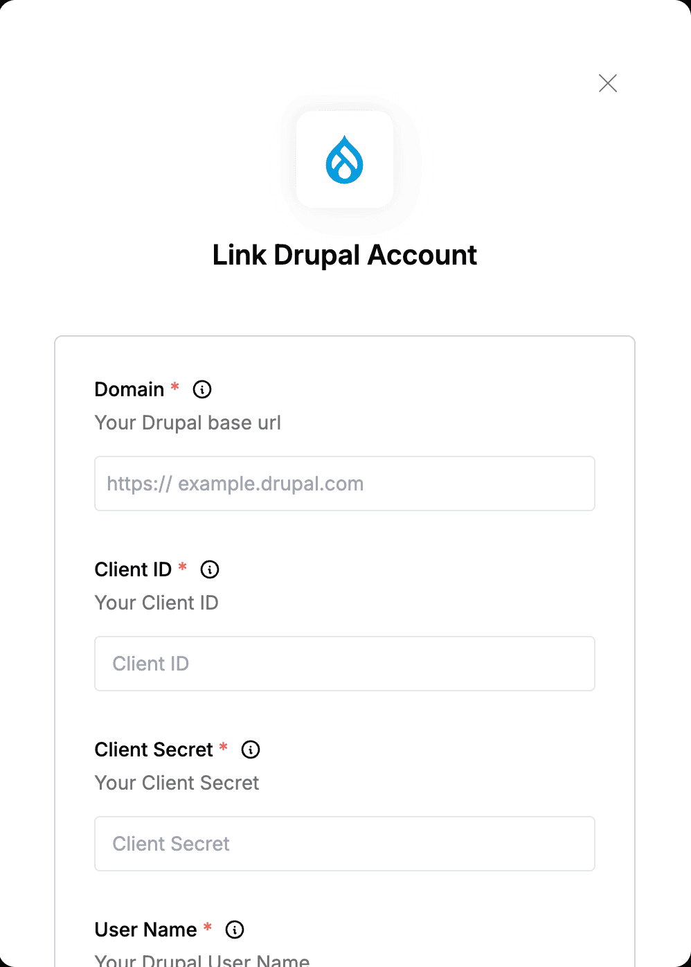 To authenticate with Drupal, you need:- Base Url - The base URL to your Drupal instance.