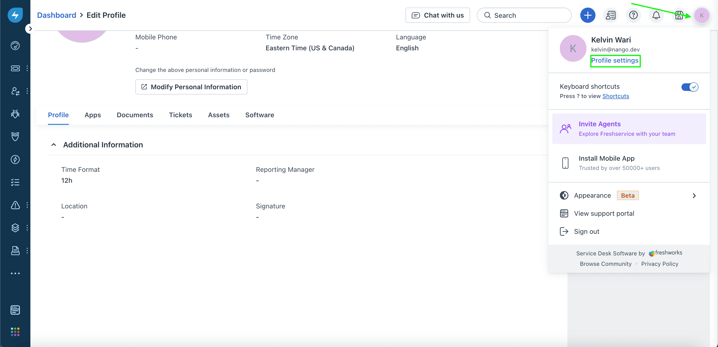 1. Login to your Freshservice account. Click on your Profile picture and select Personal Settings.