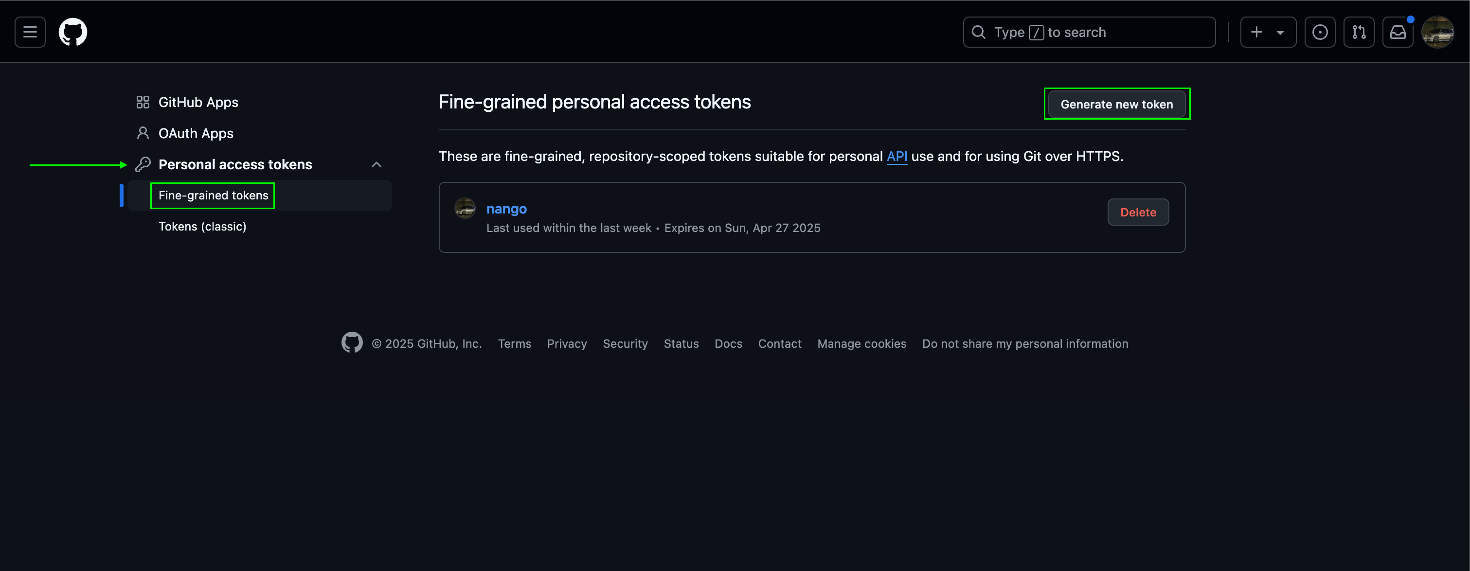 1. In the left sidebar, under Personal access tokens, click Fine-grained tokens.