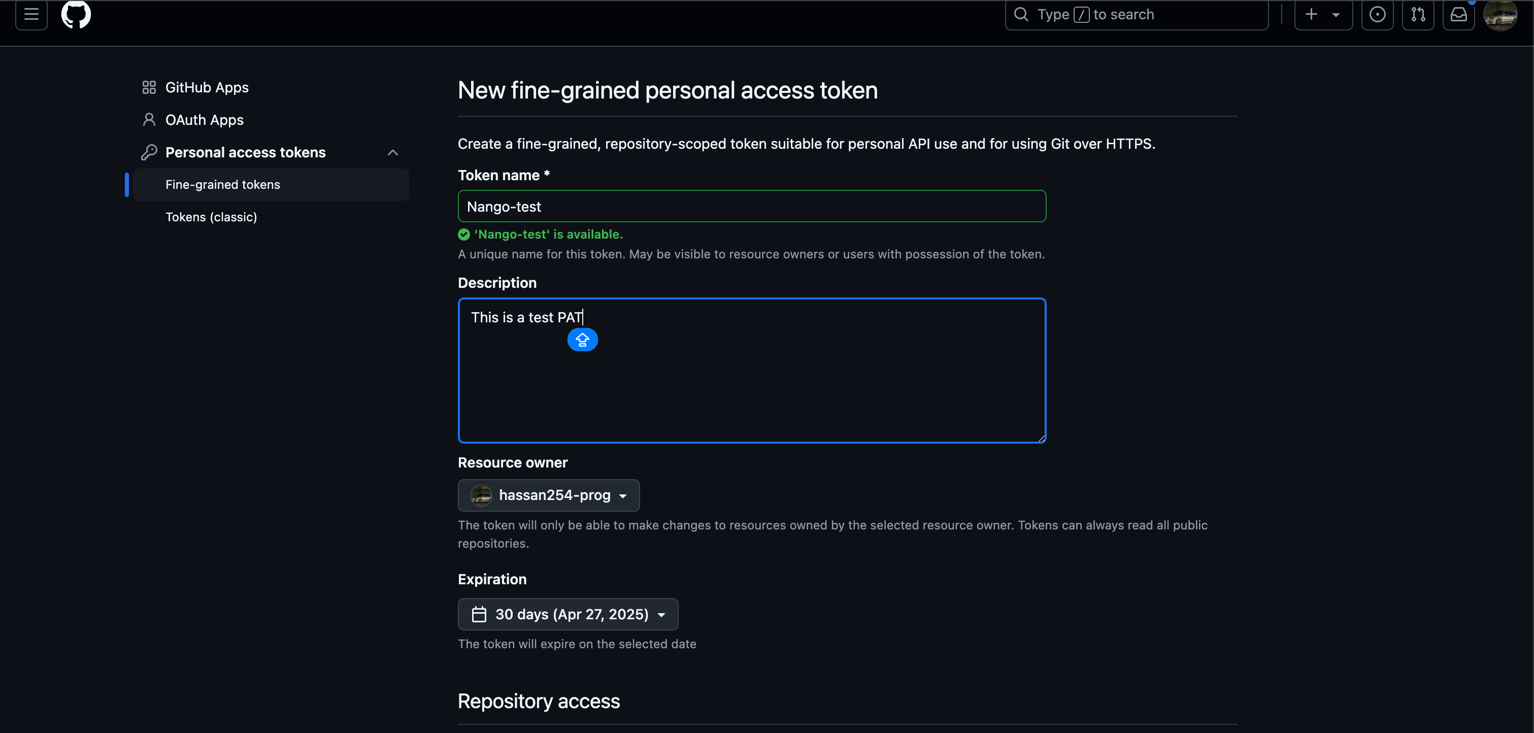 Optionally, if the resource owner is an organization that requires approval for fine-grained personal access tokens, below the resource owner, in the box, enter a justification for the request.