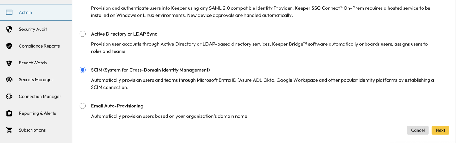 - Navigate and select SCIM (System for Cross-Domain Identity Management) and select Next.