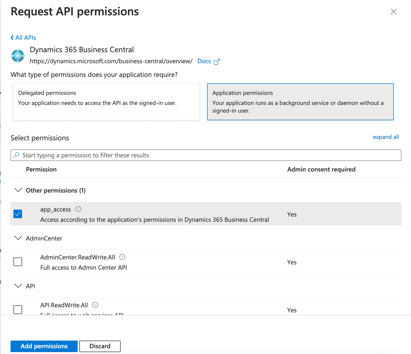1. Select Application permissions, choose the required permissions, and then click Add permissions.