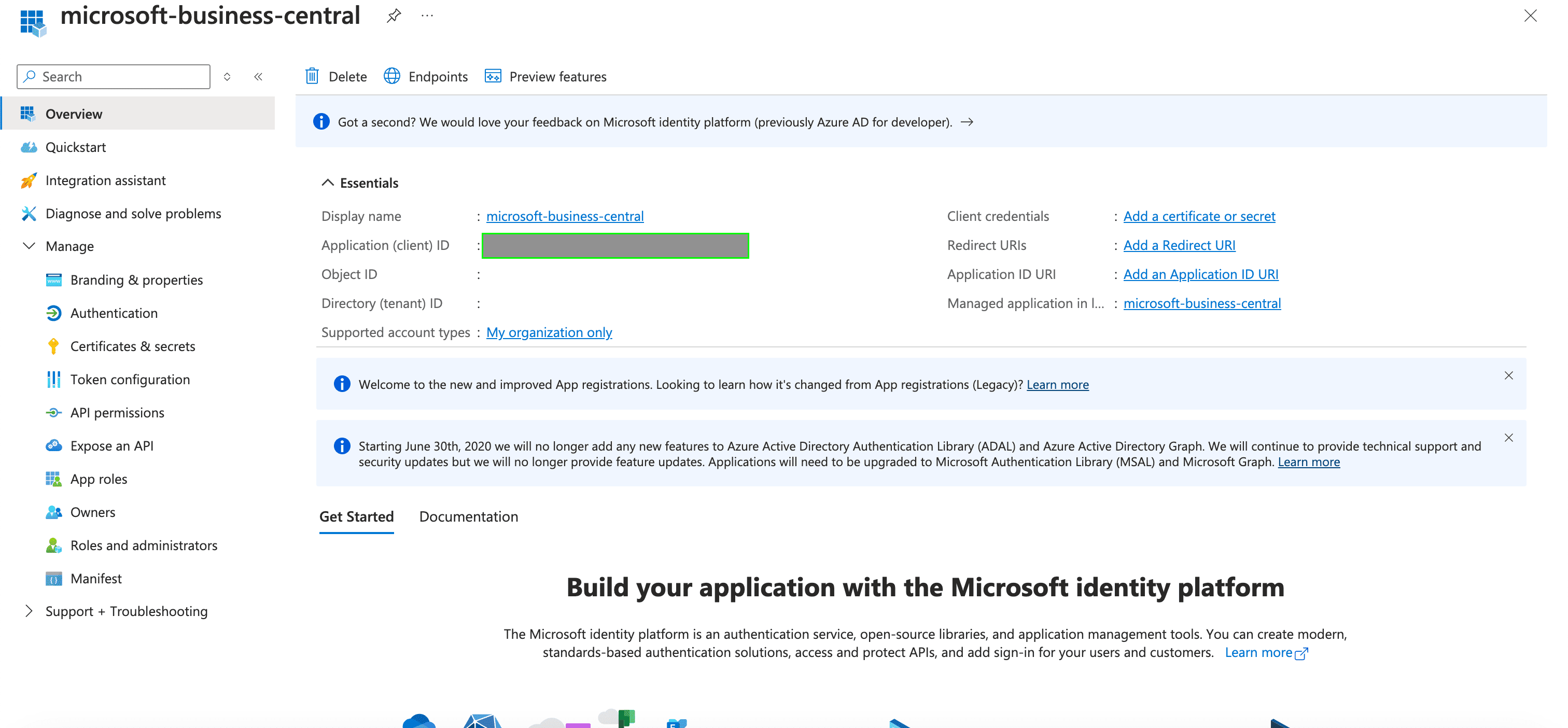 1. Once you have registered your application, your Client ID will be displayed in the Application (client) ID field within the Essentials.