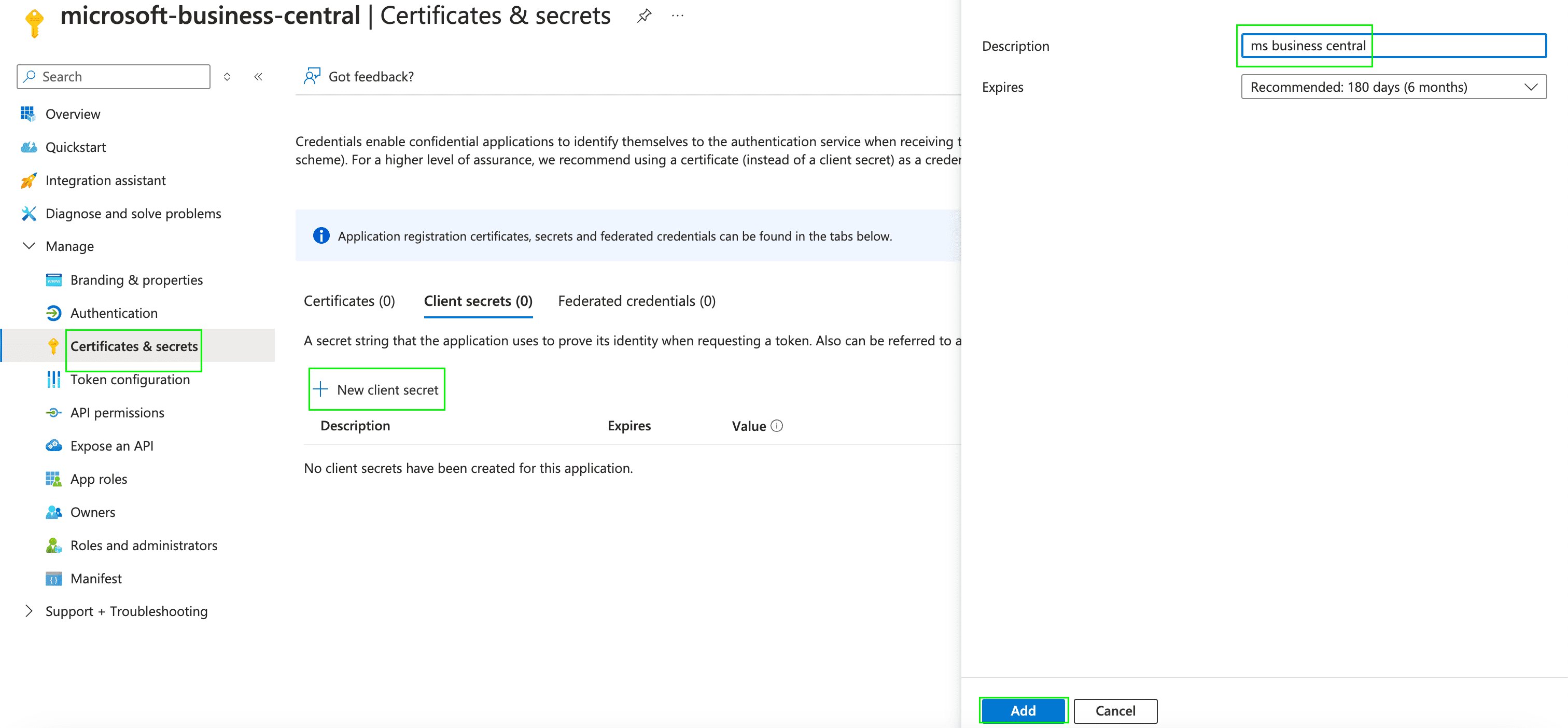 1. After registering a new app in the step above, you can now generate a client secret for that specific application. Navigate to Certificates & secrets under Manage, and click New client secret.