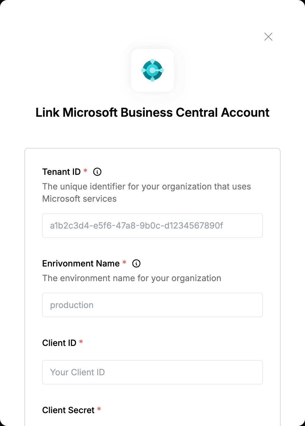 2. Enter the Tenant ID, Enrivonment Name, Client ID and Client Secret in their designated fields.
