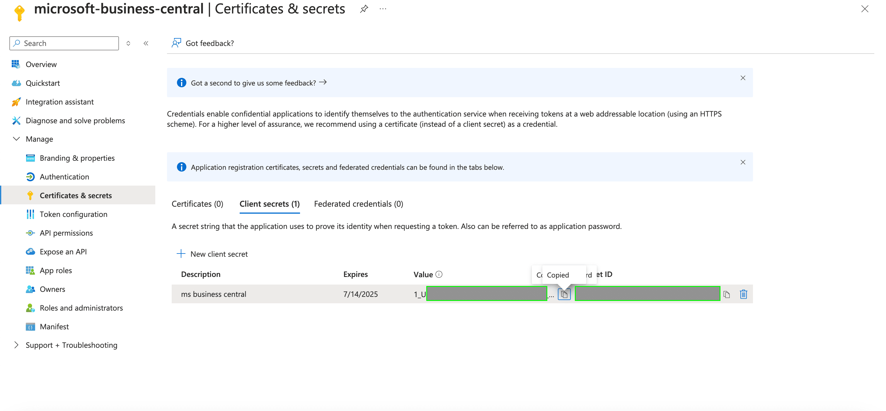 1. Once completed, your Client Secret will be generated. This value can be found in the Value field within the Client Secrets table.