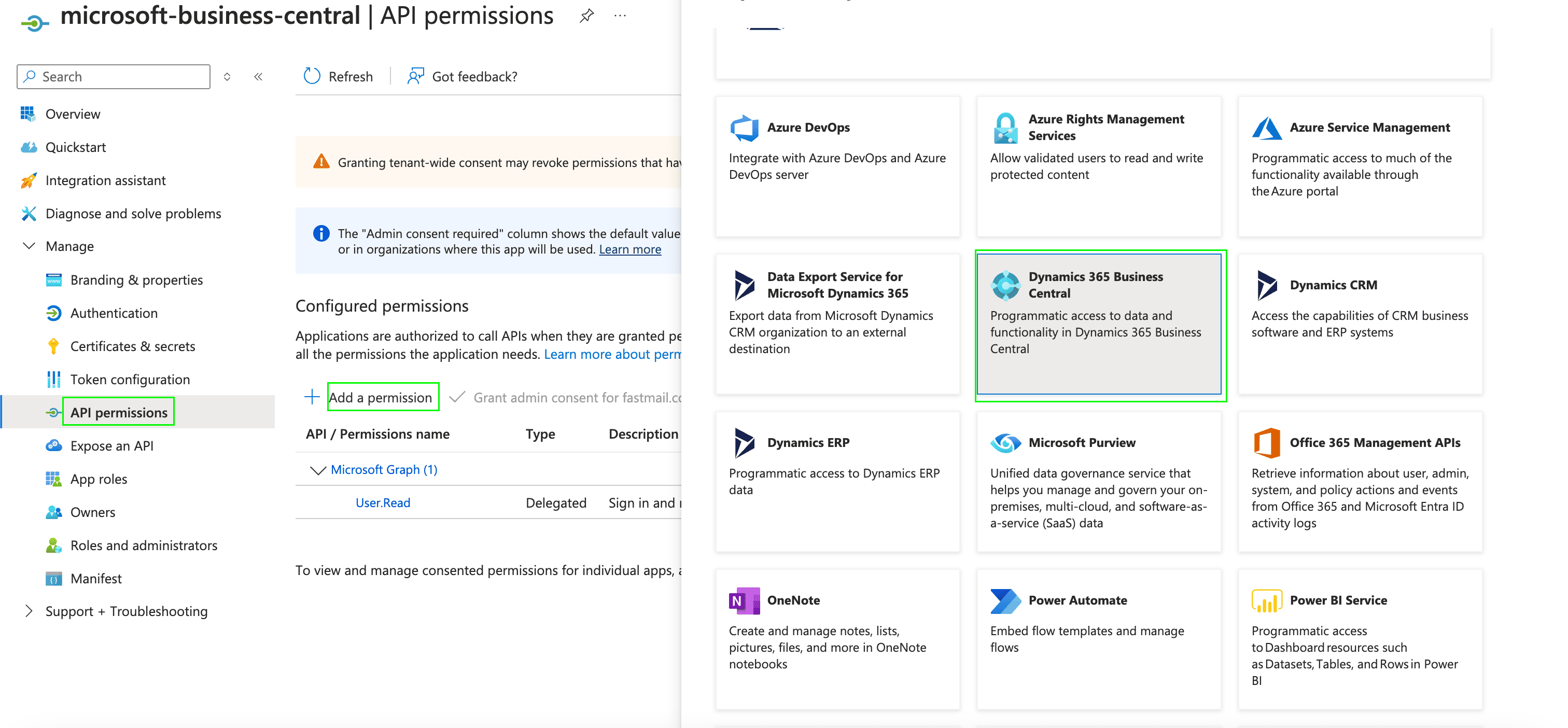 1. After generating the Client Secret, you must grant the registered application the necessary permissions for Dynamics 365 Business Central. To do this, navigate to API permissions, select Add a permission, and choose Dynamics 365 Business Central.