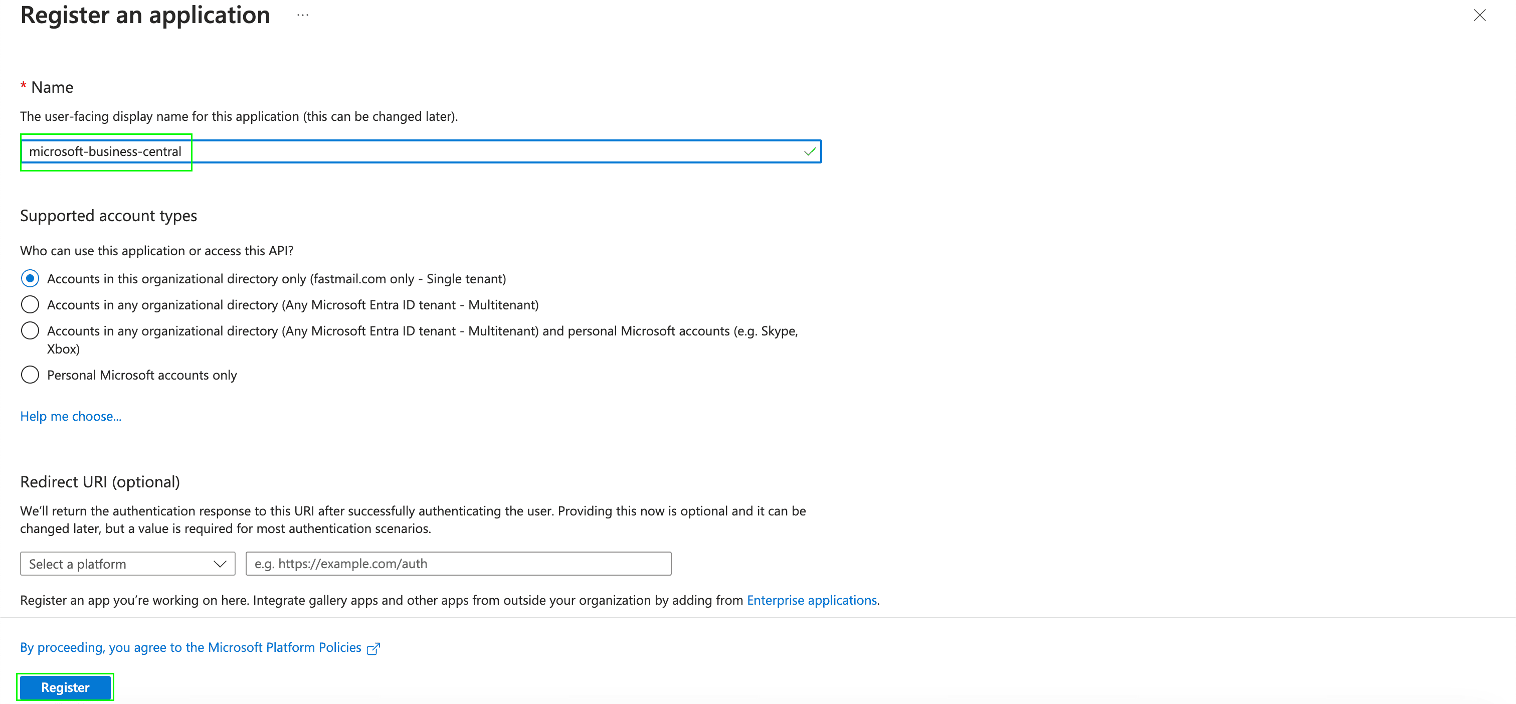 1. In the Register an application section, enter a meaningful application name to display to users. Select who can use this application based on your environment and click Register.