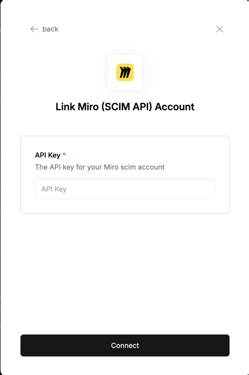 To authenticate with Miro, you need one key piece of information:- API Key - Your Miro API Key