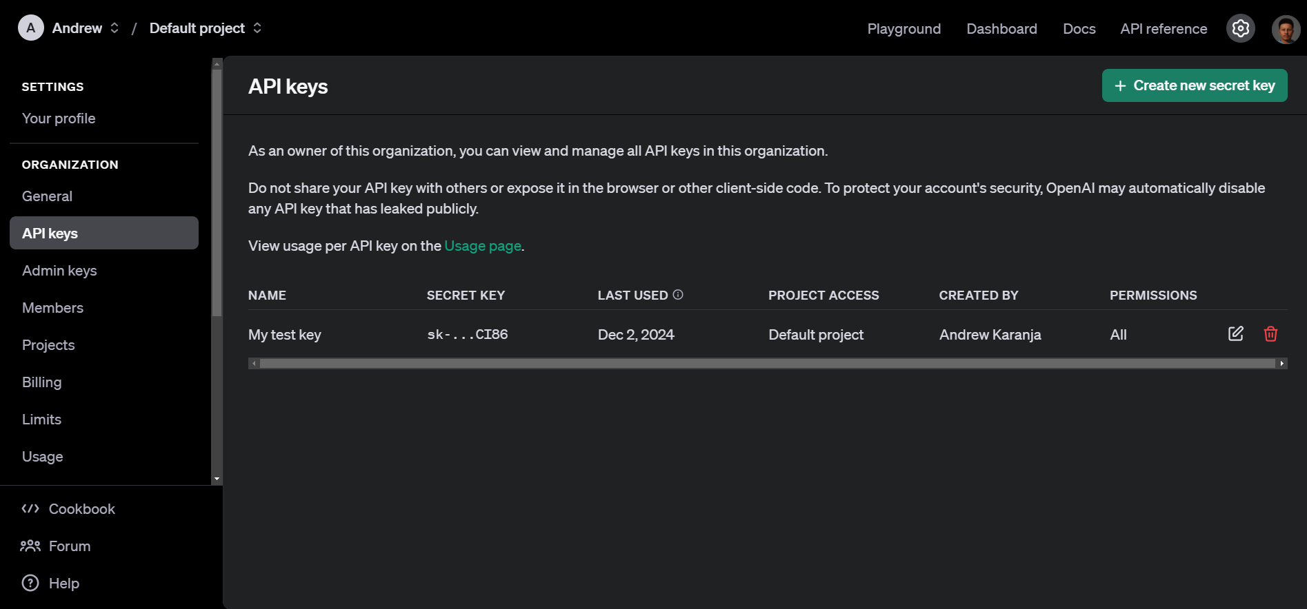 Click Create new secret key to generate a new API key.