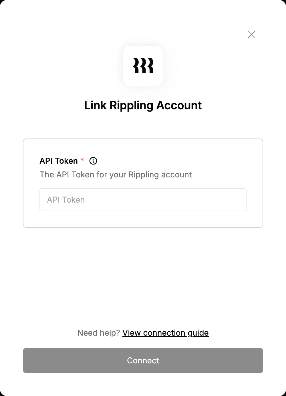 To authenticate with Rippling, you need:- API Token - A key that grants secure access to the API, enabling authorized applications to interact with Rippling resources and services.