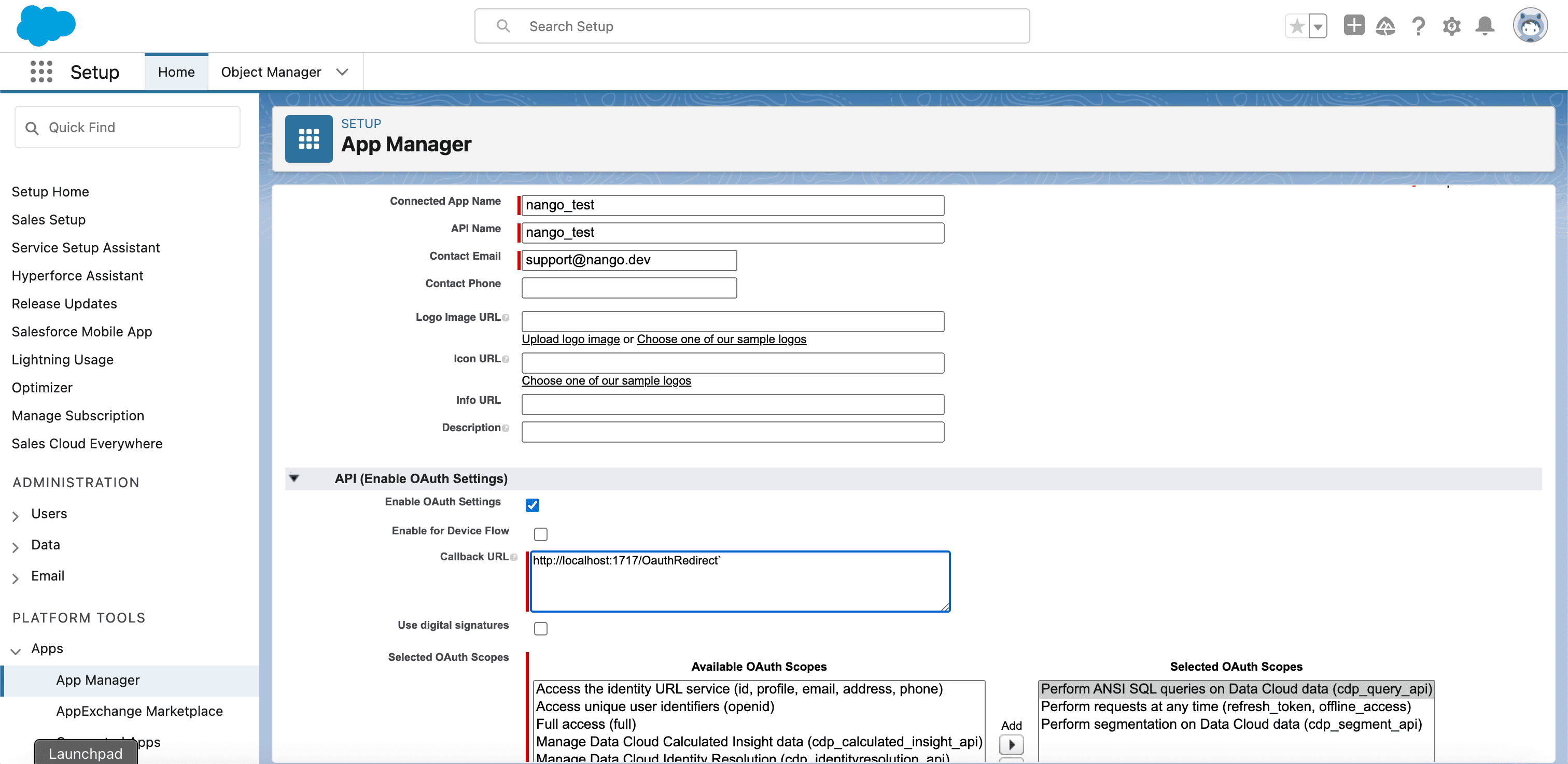 7. Add the OAuth scopes that are necessary for your use case. For example, if your use case requires you to ingest content, add the Manage Data Cloud Ingestion API data (cdp_ingest_api) scope.